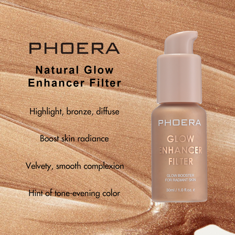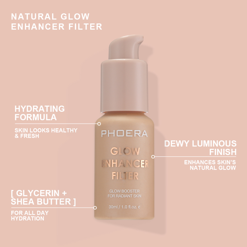 Pair it with the PHOERA Natural Glow Enhancer Filter to boost your skin’s natural radiance. This liquid face highlighter delivers an instant luminous tint, hydrates the skin, and creates a sun-kissed glow—no sun required. Use it on its own for a natural sheen, under or over makeup for extra glow, mix it with foundation for a dewy finish, or apply as a highlighter on the high points of your face.