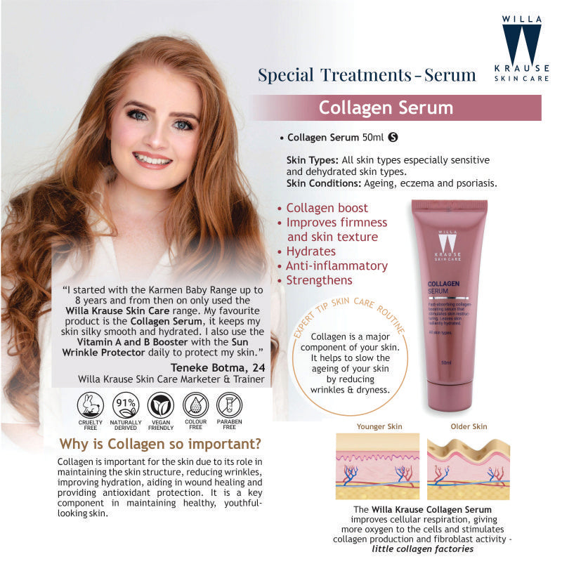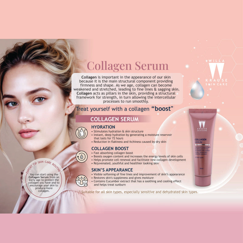 Willa Krause- Collagen Serum is A fast-absorbing collagen-boosting serum that stimulates skin restructuring, leaving the skin radiantly hydrated with a healthy glow.