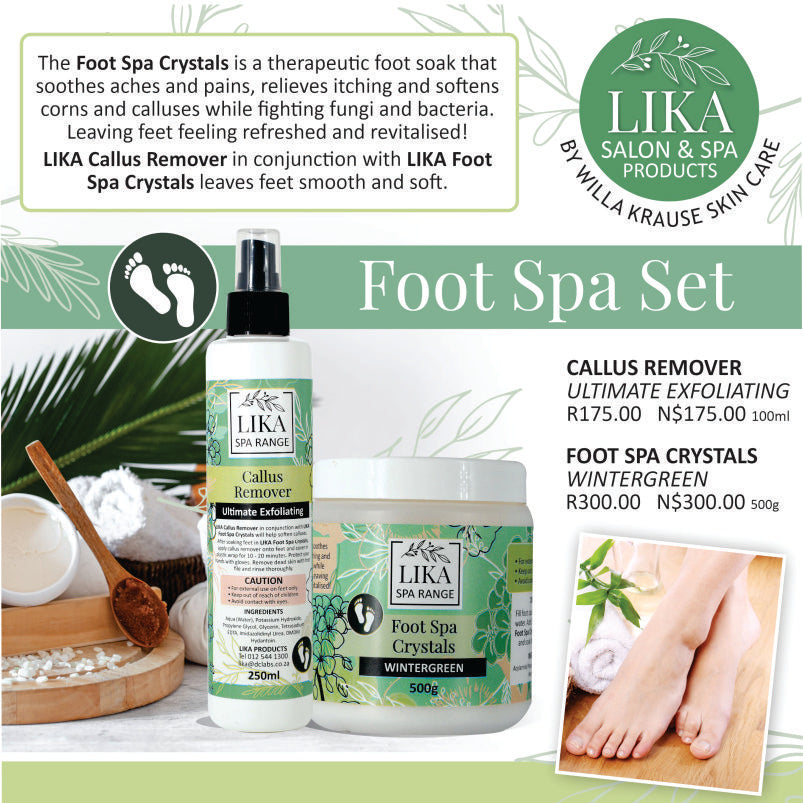The Willa Krause - Lika Salon and Spa Products - Foot Spa Crystals is a therapeutic foot soak that soothes aches and pains, relieves itching and softens corns and calluses while fighting fungi and bacteria. Leaving feet feeling refreshed and revitalised Lika Callus remover in conjunction with Lika foot Spa Crystals leaves feet smooth and soft.